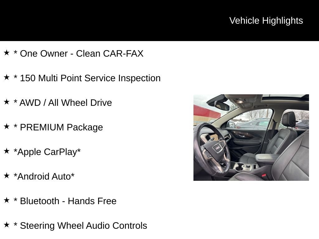 * One Owner - Clean CAR-FAX, * 150 Multi Point Service Inspection, * AWD / All Wheel Drive, * PREMIUM Package, *Apple CarPlay*, *Android Auto*, * Bluetooth® - Hands Free, * Steering Wheel Audio Controls, * Navigation System / GPS, * Remote Vehicle Starter, * Rear Backup Camera, * Lane Departure Warning, * Blind Spot Monitoring, * Rear Cross Traffic Alert, * Forward Collision Warning, * Pushbutton Start, * Remote Keyless Entry, * Power Drivers Seat, * Heated - Leather Seats, * Heated & Cooled Seats, * Power Moonroof / Sunroof, * Dual-Zone Climate Control, * BOSE Sound System, * Sirius XM Radio, * Power Liftgate, * LED Headlights, * Premium Wheels, Terrain Denali, AWD.