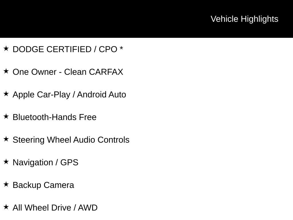 DODGE CERTIFIED / CPO *, One Owner - Clean CARFAX, Apple Car-Play / Android Auto, Bluetooth-Hands Free, Steering Wheel Audio Controls, Navigation / GPS, Backup Camera, All Wheel Drive / AWD, Heated-Leather Seats, Push Button Start, Remote Vehicle Starter, Remote Keyless Entry, Dual Zone Auto-Climate Control, Premium Alloy Wheels, Blind Spot Monitoring, Full Power Options: Locks & Windows, Cruise Control, AWD.