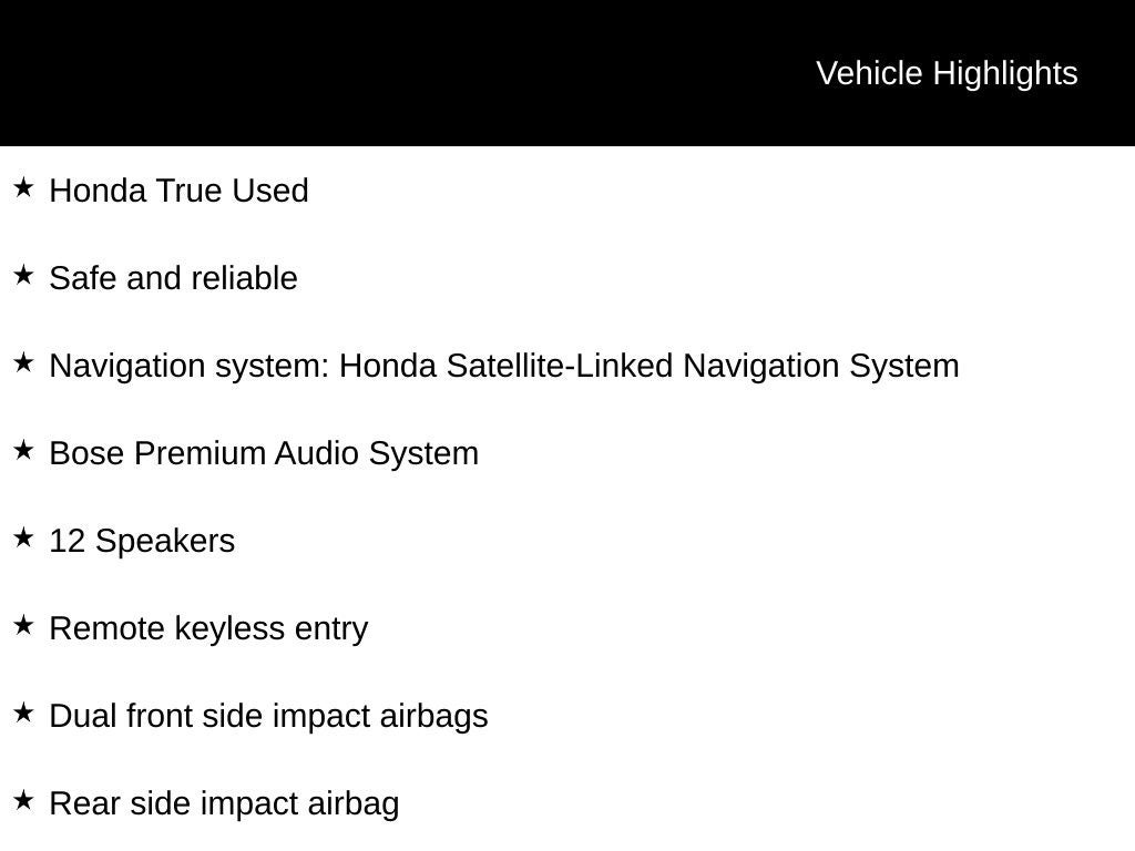 Honda True Used, Safe and reliable, Black w/Leather Seat Trim, 12 Speakers, 18 Alloy Wheels, Adaptive Cruise Control: Adaptive Cruise Control (ACC) with Low-Speed Follow, Apple CarPlay/Android Auto, Auto-dimming Rear-View mirror, Blind Spot Information (BSI) System warning, Bose Premium Audio System, Dual front impact airbags, Dual front side impact airbags, Forward collision: Collision Mitigation Braking System (CMBS) + FCW mitigation, Fully automatic headlights, Heated front seats, Knee airbag, Lane departure: Lane Keeping Assist System (LKAS) active, Navigation system: Honda Satellite-Linked Navigation System, Overhead airbag, Power passenger seat, Rain sensing wipers, Rear side impact airbag, Remote keyless entry.