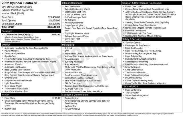 Recent Arrival! 2022 Hyundai Elantra SEL, Inventory Reduction Sale *, Low Miles = More Warranty*, One Owner *, Clean Car-Fax *, Bluetooth-Hands Free *, Steering Wheel Audio Controls *, Back Up Camera *, Alloy Wheels *, Convenience Package, Electronic Parking Brake, Forward Collision Avoidance Assist, Full 10.25" LCD TFT Cluster, Heated Front Seats, Heated Outside Mirrors, Leather-Wrapped Steering Wheel, Option Group 02, Smart Cruise Control w/Stop & Go, Wireless Device Charging.