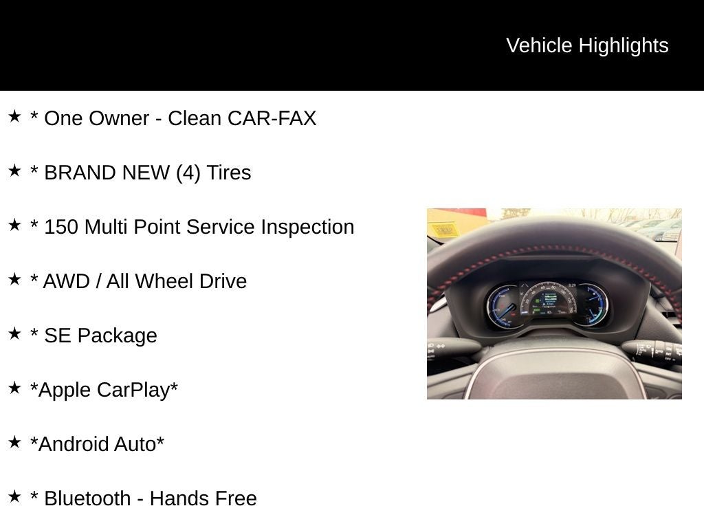 * One Owner - Clean CAR-FAX, * BRAND NEW (4) Tires, * 150 Multi Point Service Inspection, * AWD / All Wheel Drive, * SE Package, *Apple CarPlay*, *Android Auto*, * Bluetooth® - Hands Free, * Steering Wheel Audio Controls, * Rear Backup Camera, * Adaptive Cruise Control, * Lane Departure Warning, * Blind Spot Monitoring, * Forward Collision Warning, * Pushbutton Start, * Remote Keyless Entry, * Sirius XM Radio, RAV4 Prime SE, AWD.
