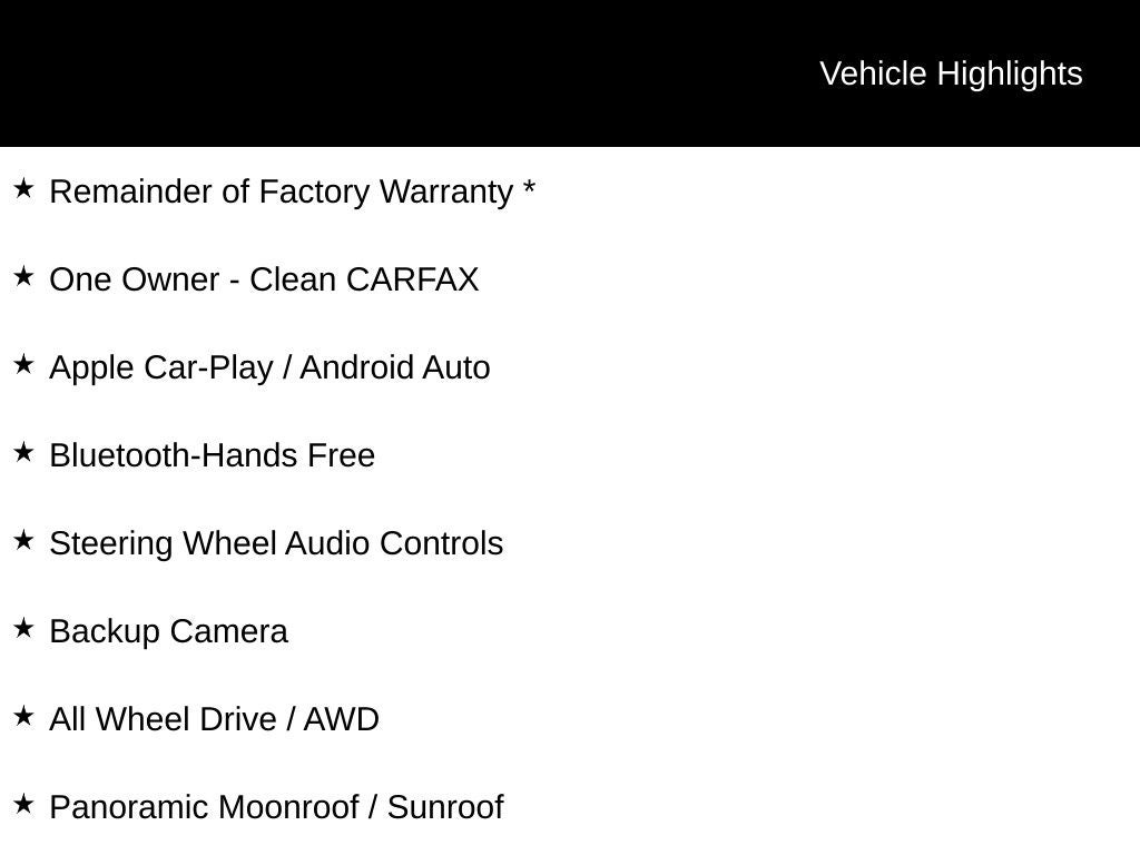 Remainder of Factory Warranty *, One Owner - Clean CARFAX, Apple Car-Play / Android Auto, Bluetooth-Hands Free, Steering Wheel Audio Controls, Backup Camera, All Wheel Drive / AWD, Panoramic Moonroof / Sunroof, Heated & Cooled Seats, Push Button Start, Remote Vehicle Starter, Dual Zone Auto-Climate Control, Front & Rear Parking Sensors, Adaptive Cruise Control, Lane Departure Warning, Blind Spot Monitoring, Rear Cross-Traffic Alert, Forward Collision Warning, Power Liftgate, AWD. 18/26 City/Highway MPG